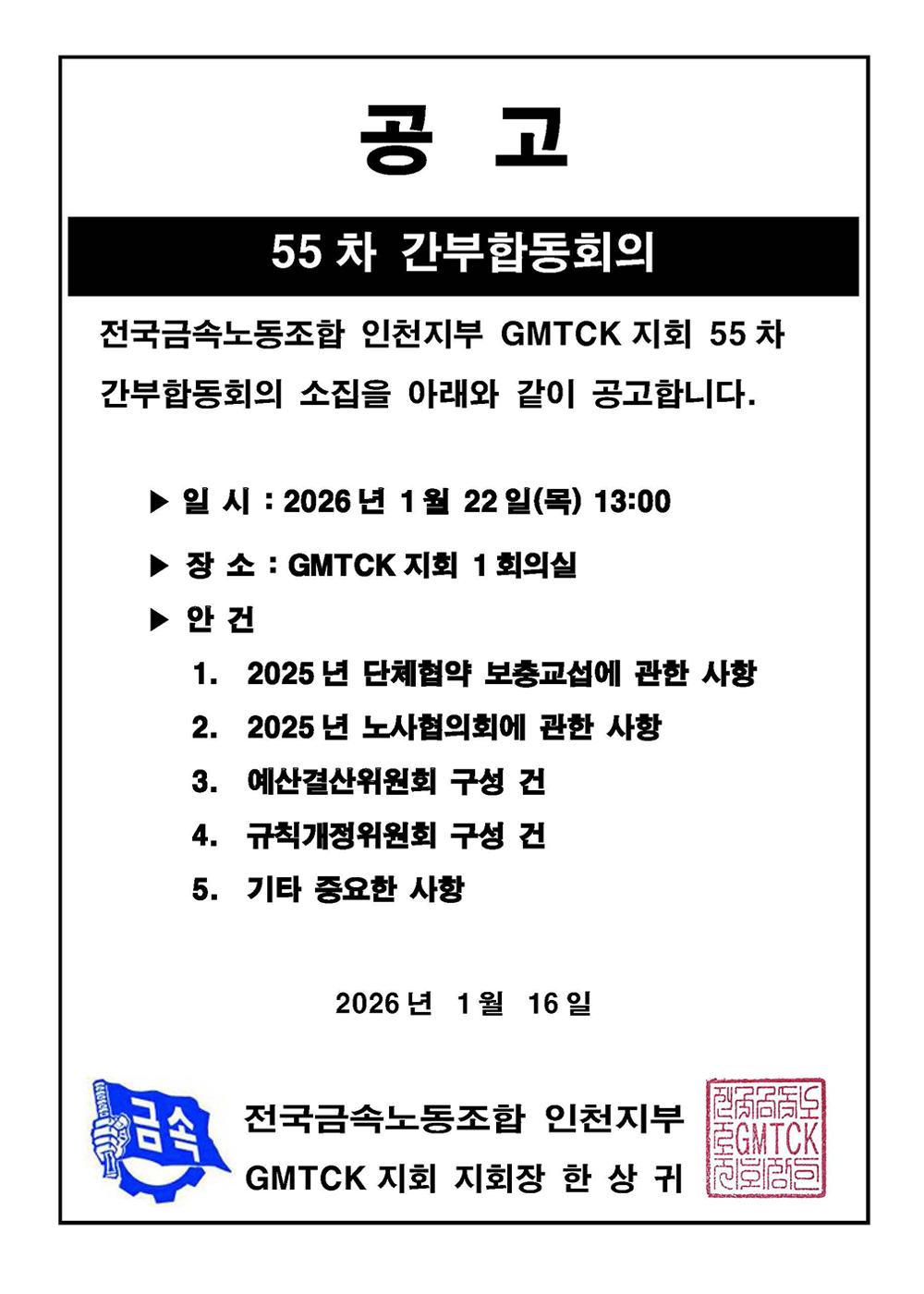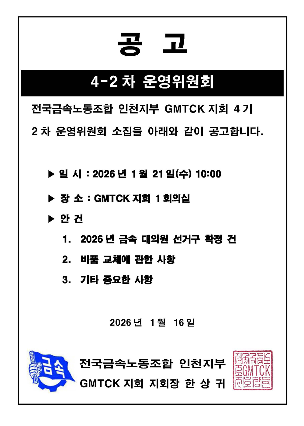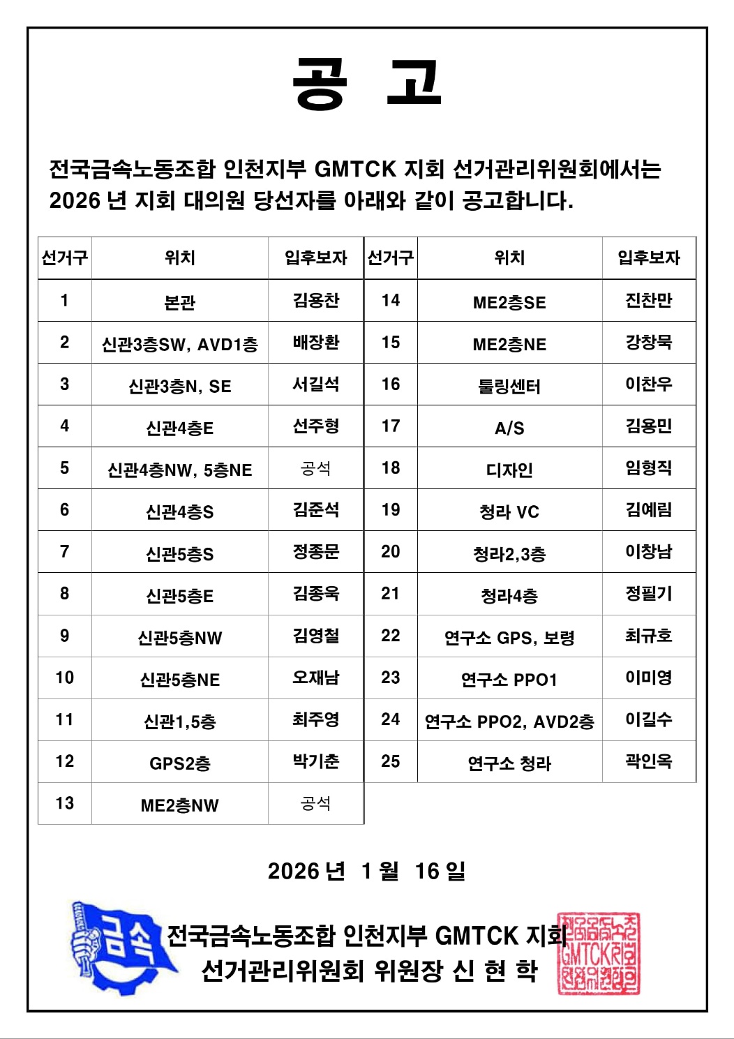 2026년 GMTCK지회 대의원 당선 공고